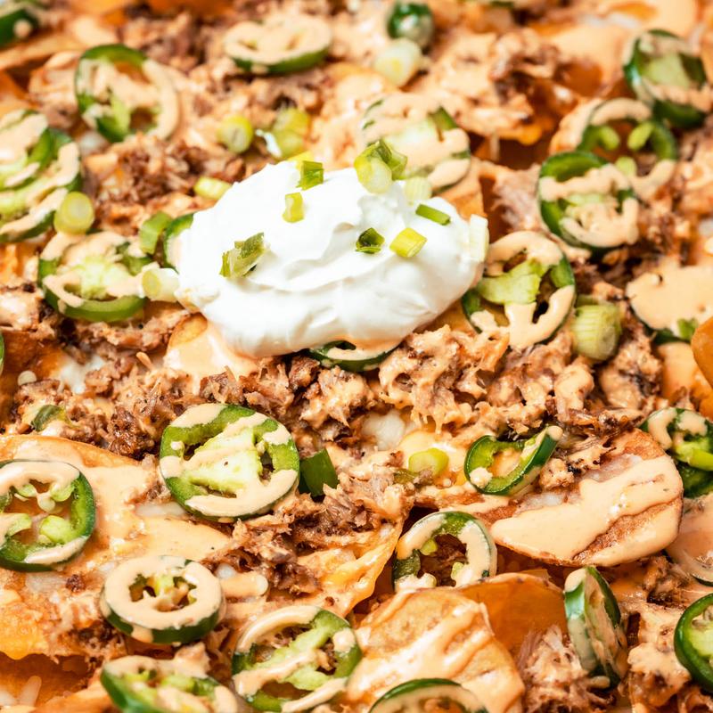 Kettle chips, pulled pork, shredded cheese, chives, fresh jalapenos and sour cream.