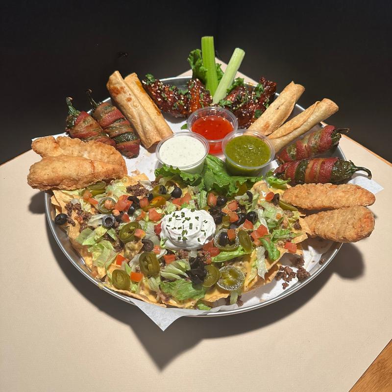 Shareable appetizer with our classic nachos, 4 armadillo eggs, 4 taquitos, 4 chicken strips & 4 wings. Feeds four. No substitutions.